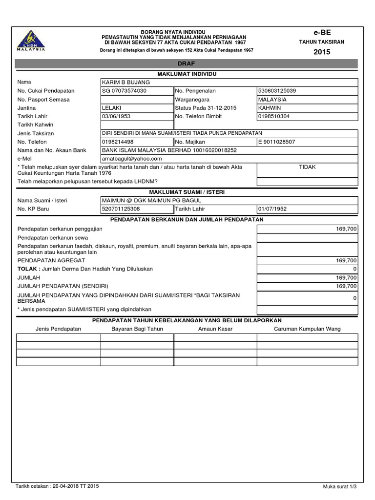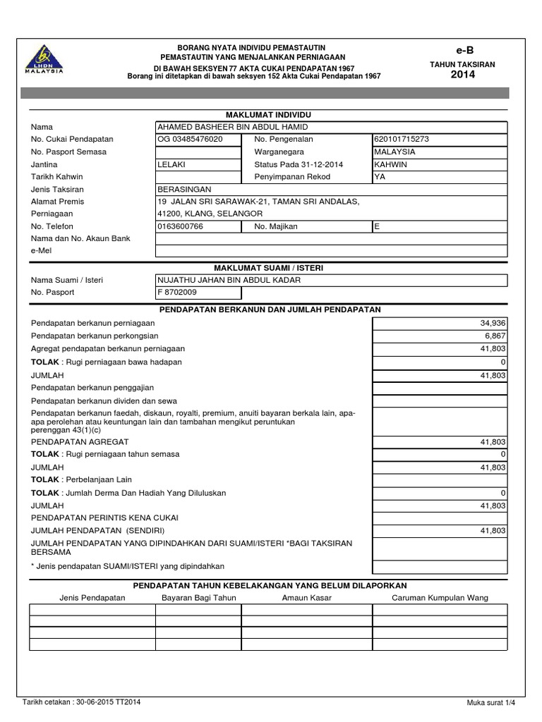 Borang nyata individu pemastautin di bawah seksyen 77 akta cukai pendapatan 1967 borang ini ditetapkan di bawah seksyen 152 akta cukai pendapatan 1967 pemastautin yang tidak menjalankan perniagaan e be pendapatan tahun kebelakangan yang belum. Pasport semasa 5 no. Return of income by a person other than a company limited liability partnership trust body or co operative society 77 a.
