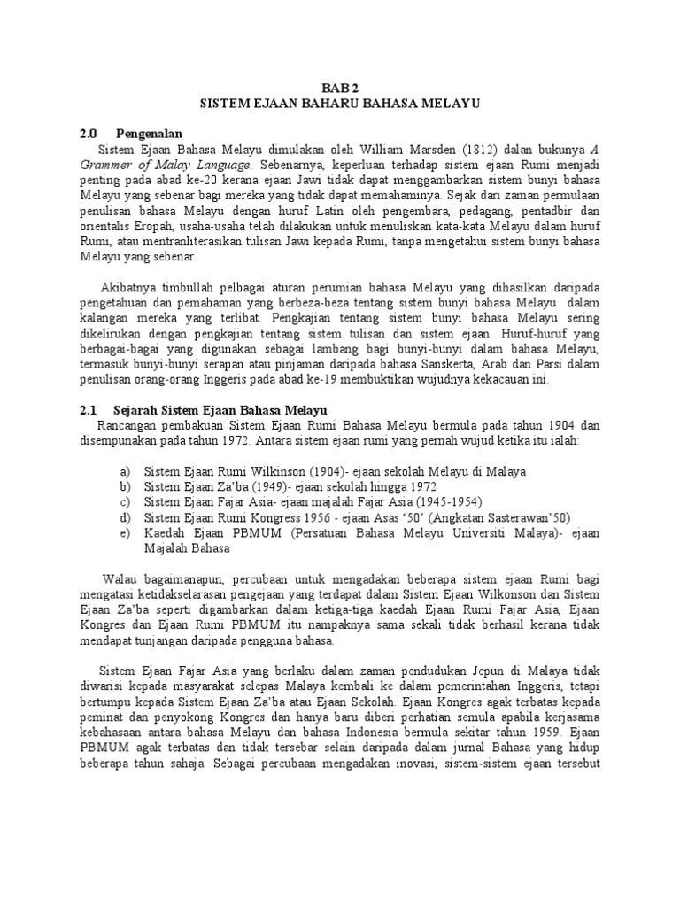 Memisahkan suku kata yang tercerai oleh penggantian baris. Sistem ejaan rumi baharu bahasa melayu sistem ejaan bahasa melayu telah engalami pembakuan sejak beratus ratus tahun jika mengambil kira tulisan jawi sebagai tulisan tradisi bahasa melayu. Kertas ini bertujuan untuk mendapatkan per timbangan pihak fakulti.