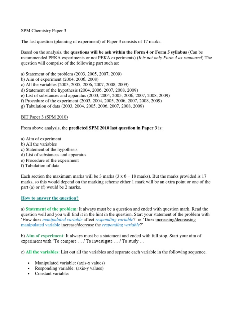 Spm chemistry paper 3 marking scheme. 15 march 2012 11 51 am. Well here s an extensive list of compiled trial papers from different states for various subjects with answers included. Biology spm 2010 paper 3 chemistry spm 2010 paper 1 chemistry spm 2010 paper 2 chemistry spm 2010 paper 3 physics spm 2010 paper 1 nil physics spm 2010 paper 2.
