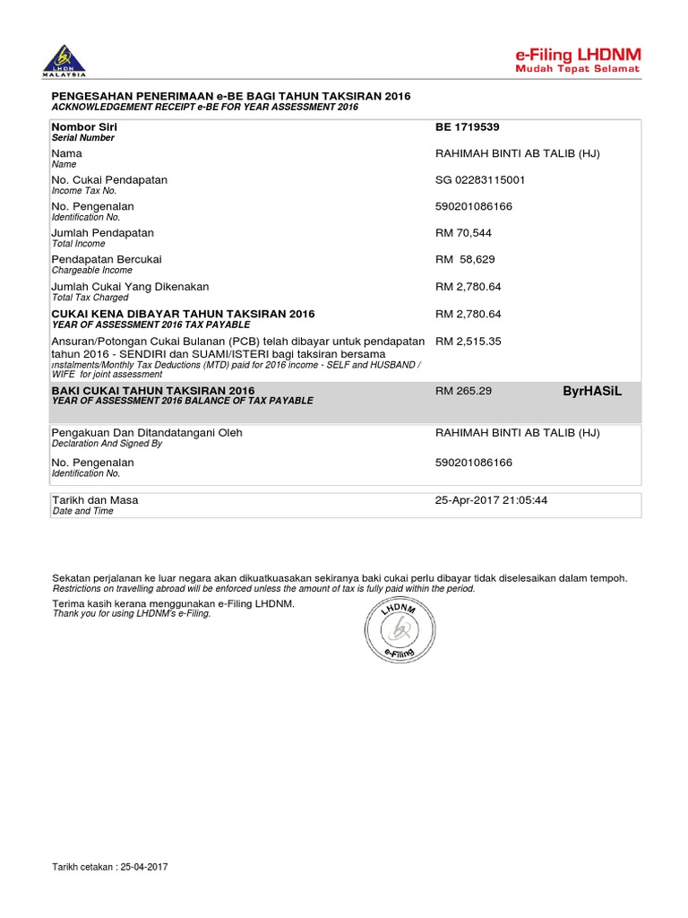 Untuk makluman pengemukaan borang nyata cukai pendapatan bncp lembaga hasil dalam negeri malaysia untuk tahun taksiran 2019melalui e filling bagi borang e be b bt p mt dan tf boleh dilakukan pada tarikh yang dinyatakan dibawah.