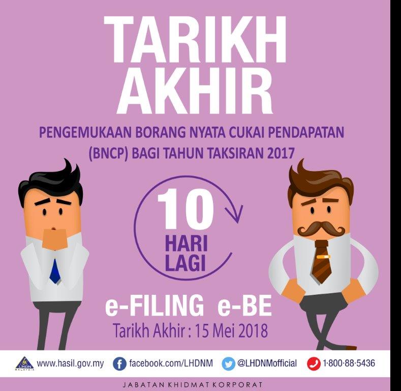Nota tarikh tertakluk kepada sebarang perubahan dari lhdn bncp yang dikemukakan melalui e filing selepas tarikh akhir pengemukaan borang berkenaan dianggap sebagai telah diterima dalam tempoh yang ditetapkan jika borang diterima dalam tempoh 15 hari selepas tarikh akhir pengemukaan borang. Bagi borang e tarikh tutup penghantaran borang secara online menerusi e filling adalah pada 31 mac 2017. Bagi borang e tarikh tutup penghantaran borang secara online menerusi e filling adalah pada 31 mac 2017.