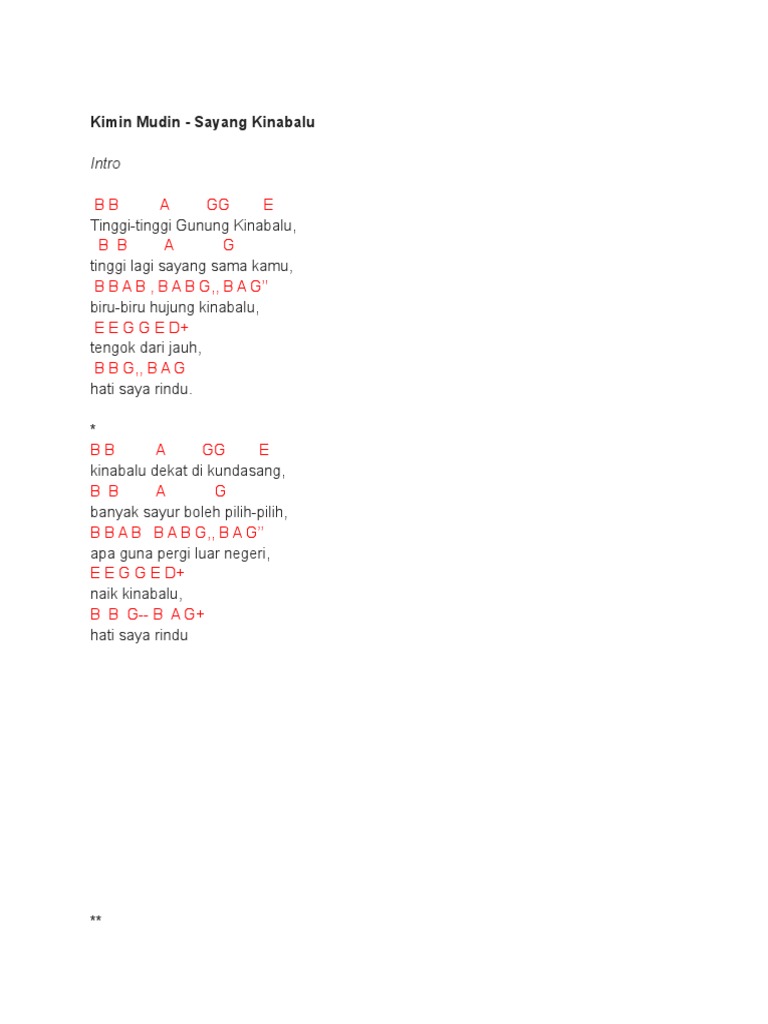 Kimin mudin sayang kinabalu chord key. Tinggi tinggi gunung kinabalu g a tinggi lagi sayang sama kamu d bm biru biru hujung kinabalu g tengok dari jauh a d hati saya rindu. Chords for tinggi tinggi gunung kinabalu cover.