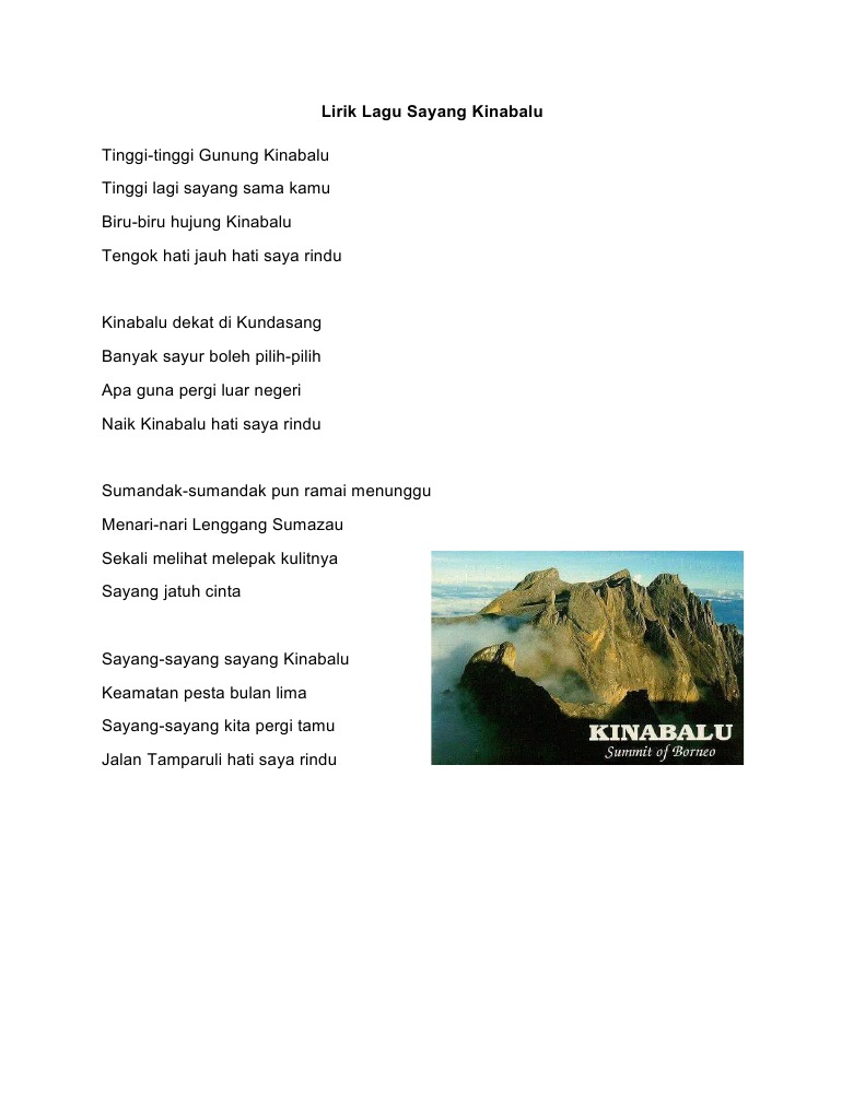 F c kinabalu dekat di kundasang f g banyak sayur puas pilih pilih am c. Tinggi tinggi gunung kinabalu tinggi lagi sayang sama kamu biru biru hujung kinabalu tengok dari jauh hati saya rindu. Sayang kinabalu tinggi tinggi gunung kinabalu tinggi lagi sayang sama kamu biru biru hujung kinabalu tengok dari jauh hati.