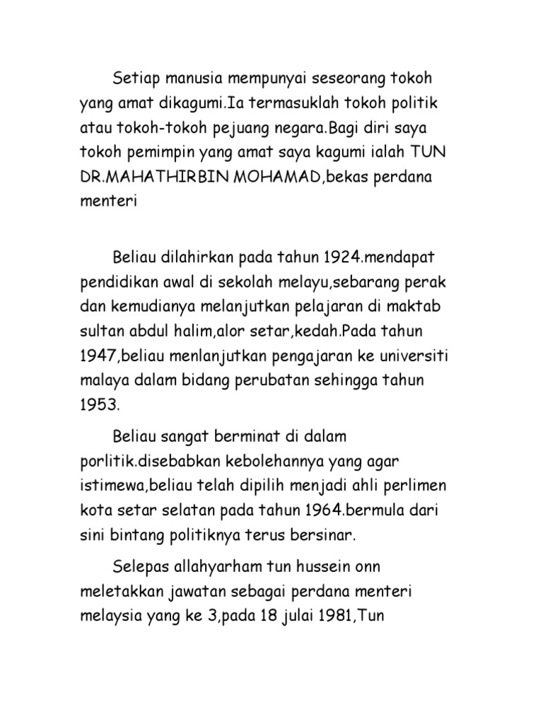 Mahathir bin mohamed bekas perdana menteri malaysia. Beliau dilahirkan pada 20 disember 1925 di sebuah rumah bernombor 18 lorong kilang ais seberang perak alor setar kedah. Contoh karangan tokoh yang saya kagumi on.