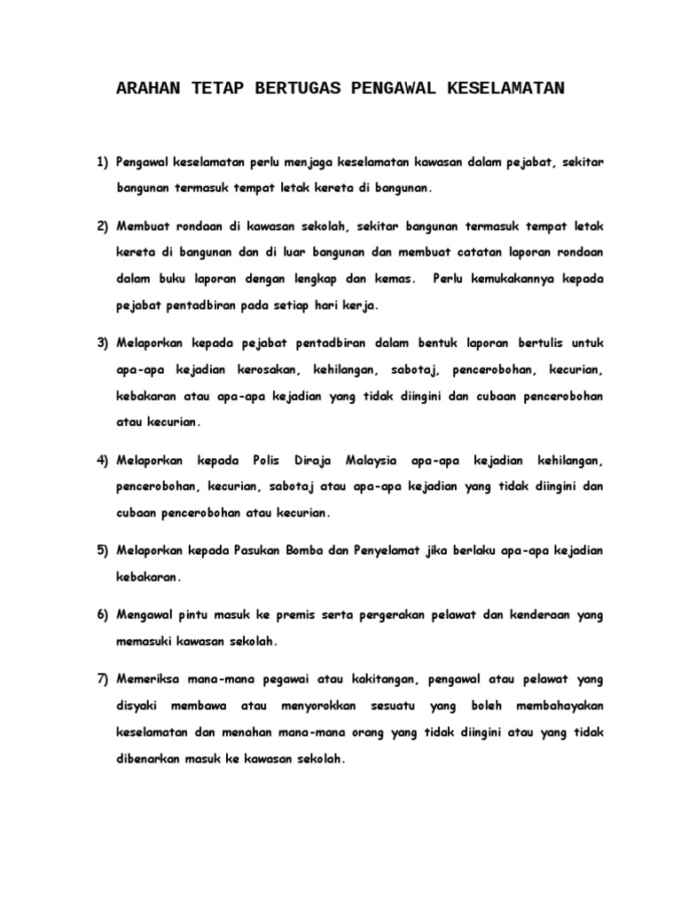 Orang kedah habaq caka cakap tak guna tembak pun tak kena. 4 1 pegawai keselamatan sekolah school safety officer sso pengawal keselamatan atau sesiapa jua yang mendapati kejadian kemalangan termasuk pelajar guru kakitangan dan warga sekolah yang lain termasuk penjaga malam hendaklah melaporkan terus kepada pengetua guru besar di sekolah berkenaan berhubung dengan kemalangan tersebut. 6464 hits assalamualaikum senarai tugas pengawal keselamatan gred kp11dapat panggilan temuduga tapi tak bersedia lagi nak pergi temuduga jawatan tak memenuhi piawai anda memang macam macam kerenah kita bila memohon jawatan aku lepasan universiti grad.