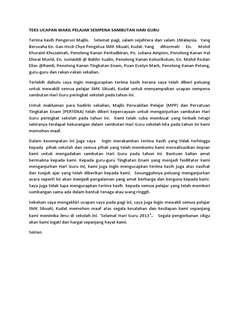 Teks Ucapan Wakil Pelajar Sempena Sambutan Hari Guru