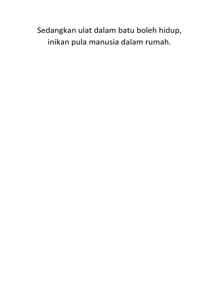 Orang yang tamak dan gelojoh tidak memilih keji atau terlarang apa yang akan diperbuatnya. Tak payahlah kamu bersusah payah merantau keluar negara semata mata untuk mencari pekerjaan kerana di sini pun masih boleh mendapat rezeki kerana ulat dalam batu pun dapat hidup kata ayah kepada abang. Allah paham doamu bahkan ketika kau kesulitan mencari kata kata.