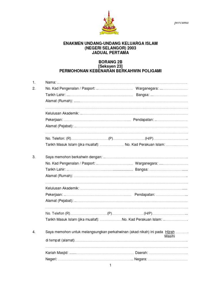 Enakmen Undang Undang Keluarga Islam Negeri Selangor 2003 Jadual Pertama Borang 2b Seksyen 23 Permohonan Kebenaran Berkahwin Poligami